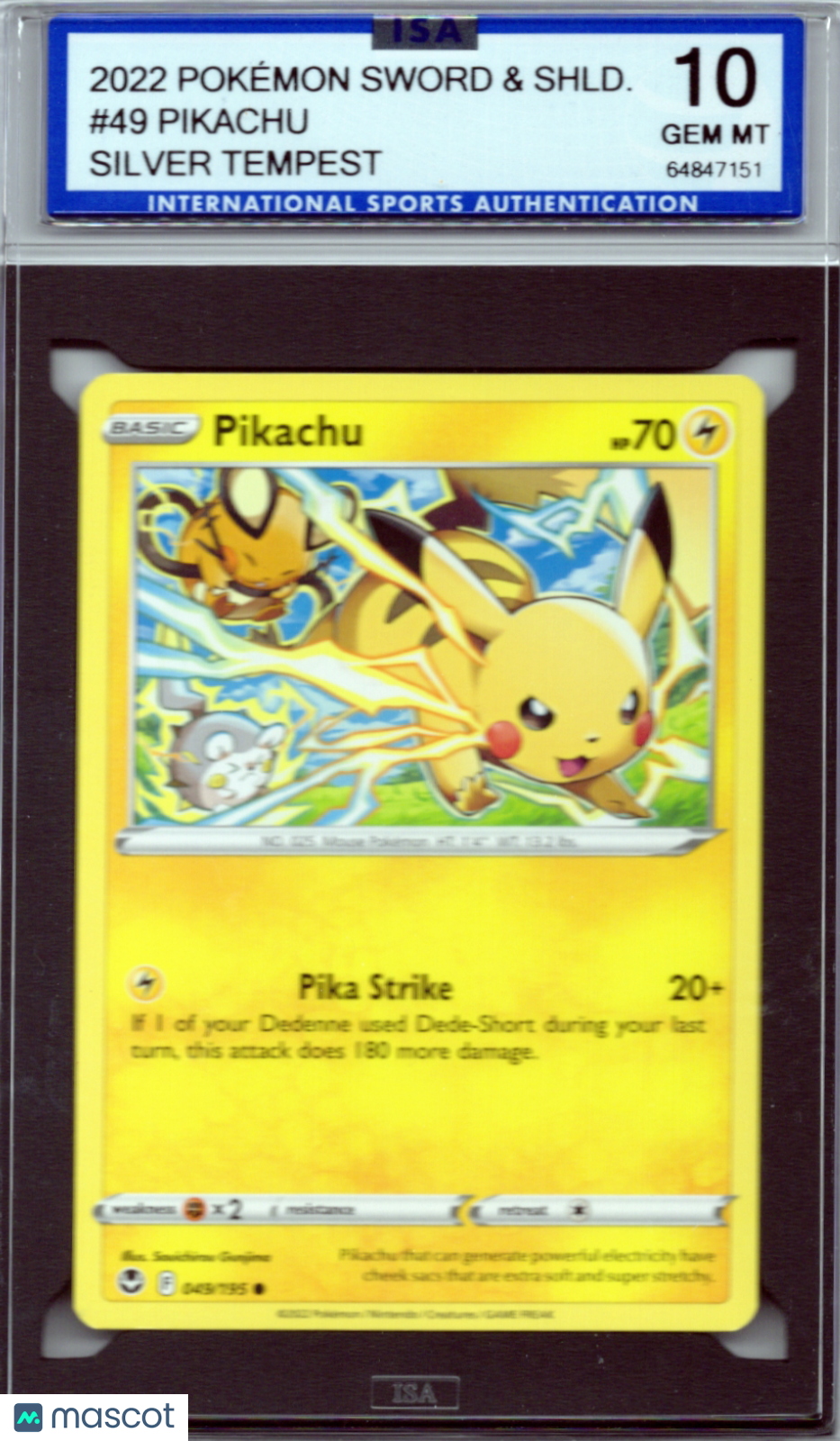 2022 POKEMON SWORD & SHLD Pikachu #49 SILVER TEMPEST ISA 10 GEM MINT
