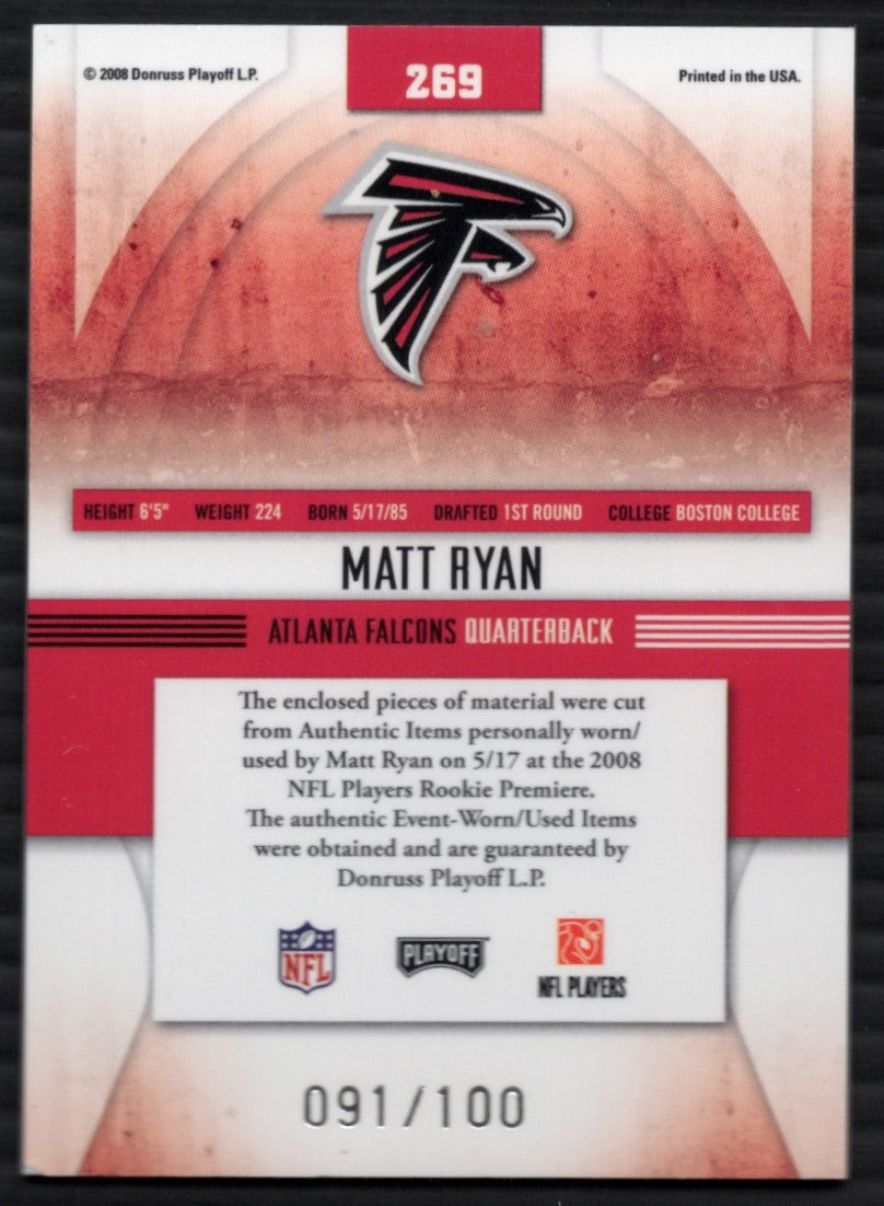 MATT RYAN 2008 ABSOLUTE MEMORABILIA ROOKIE PREMIERE MATERIALS #91/100