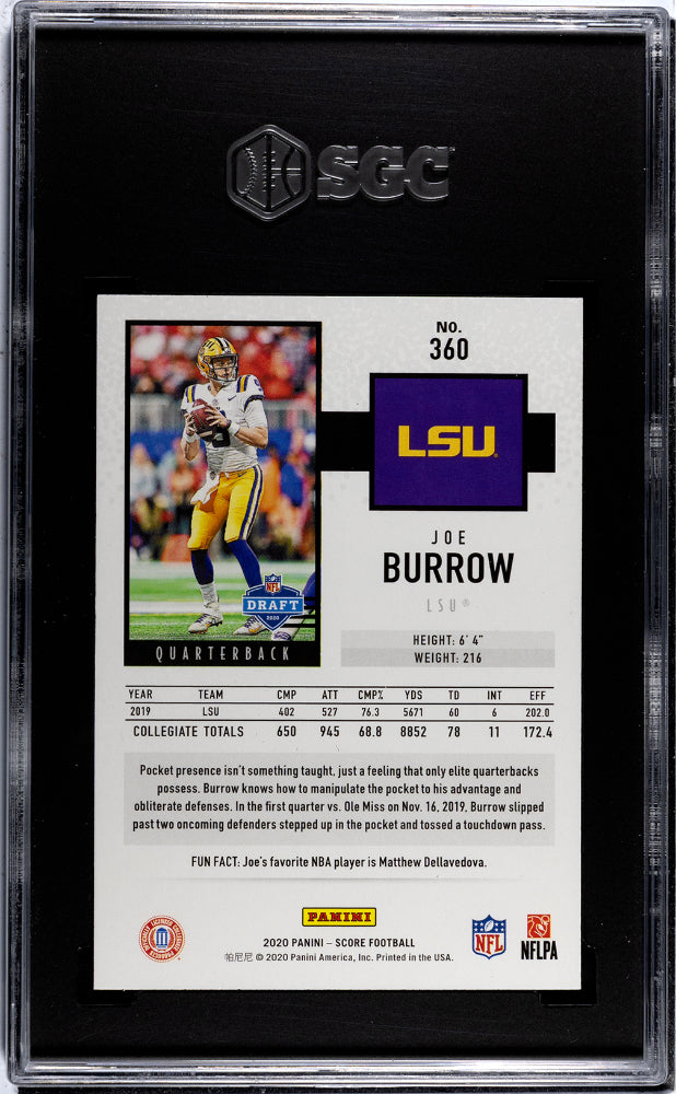 JOE BURROW 2020 PANINI SCORE LSU #360 ROOKIE RC GEM MINT SGC 9.5