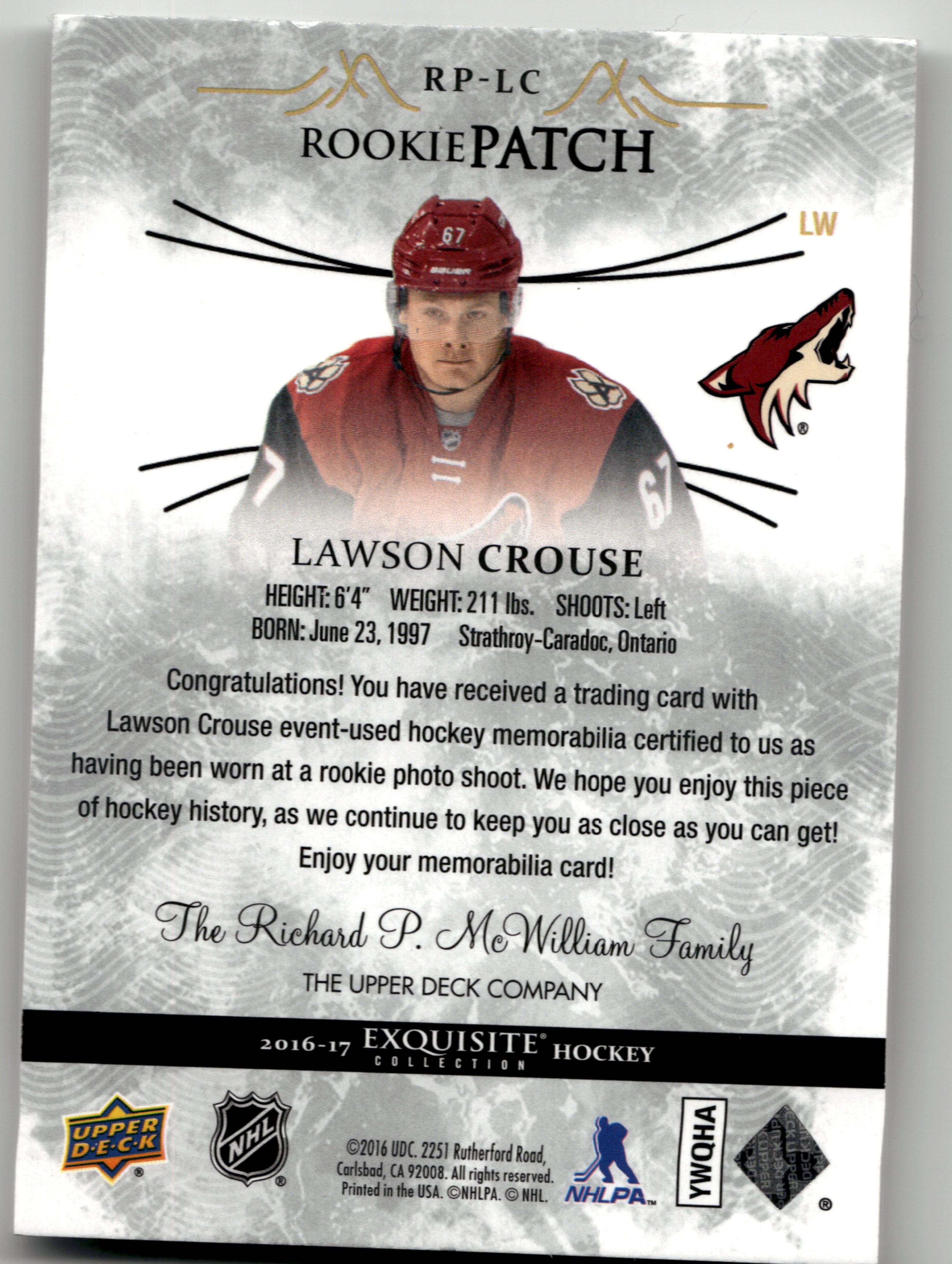 LAWSON CROUSE 2016-17 EXQUISITE COLLECTION 3-COLOR ROOKIE PATCH /299 RC