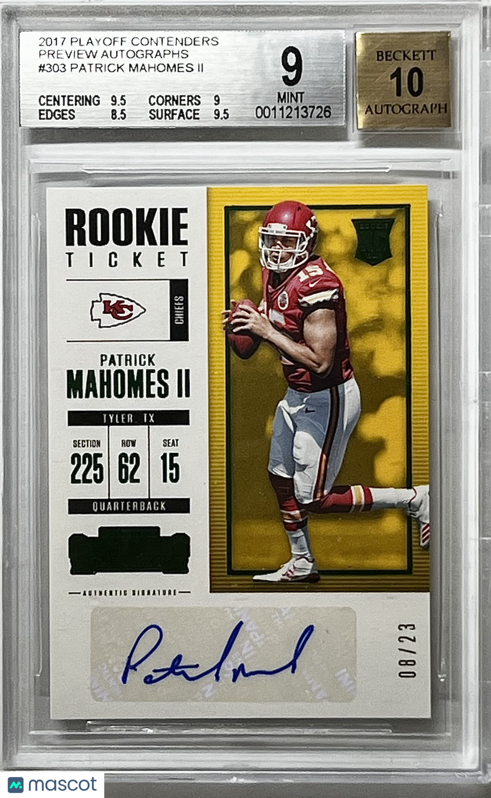 You are purchasing a 2017 Playoff Contenders Preview Autographs Patrick Mahomes II #303 BGS 9 Auto 10 08/23. You will receive the exact item in the photographs. Thank you for looking. Listed With Mascot.Returns & Exchanges