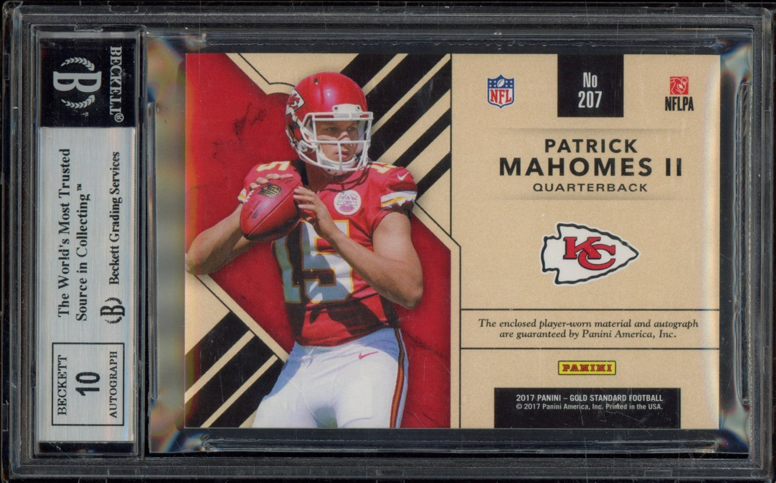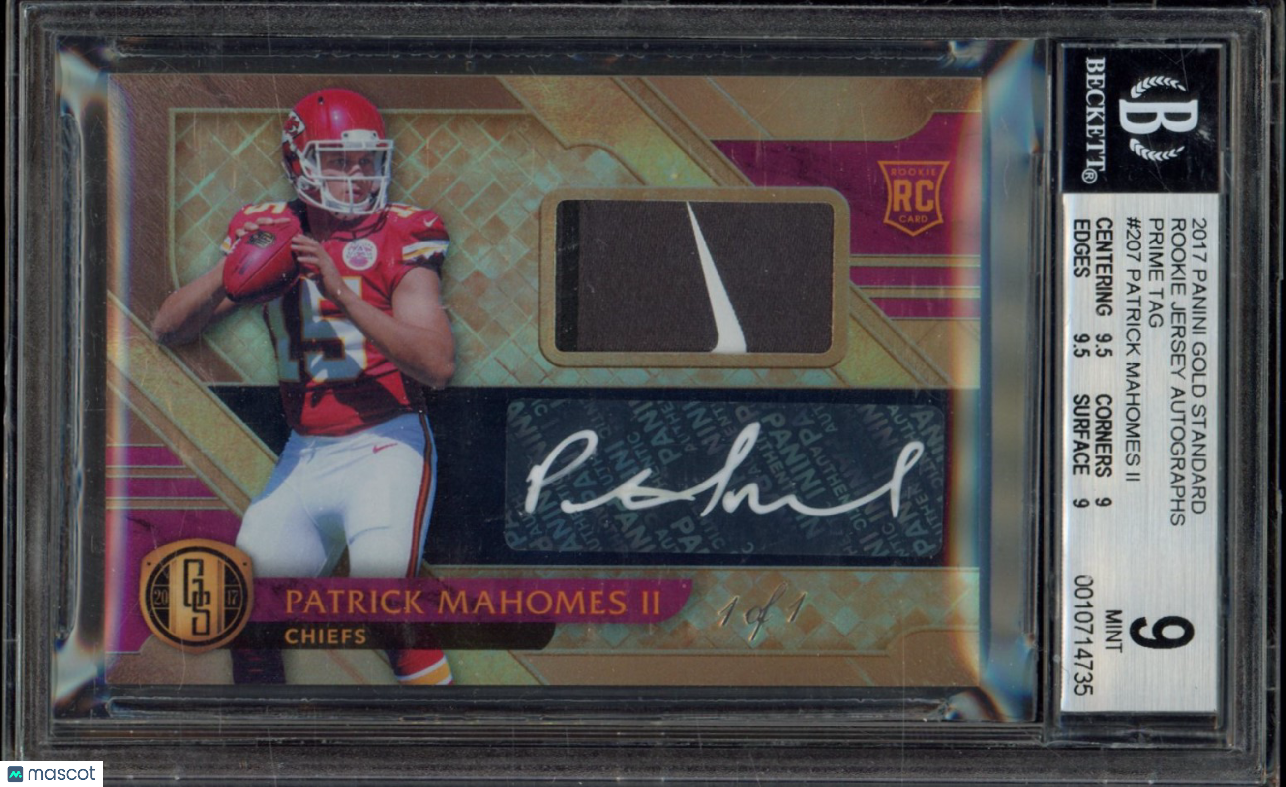 You are purchasing a 2017 Panini Gold Standard Rookie Jersey Autographs Prime Tag Patrick Mahomes II #207 BGS 9 Auto 10 1/1. You will receive the exact item in the photographs. Thank you for looking. Listed With Mascot.