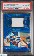 You are purchasing a 2020 Panini Certified New Generation Jerseys Justin Herbert #3 NW. Gen. Jsy Mirror Blue 18/99 PSA 7 Auto 7. ON CARD AUTO!!! You will receive the exact item in the photographs. Thank you for looking. Listed With Mascot.