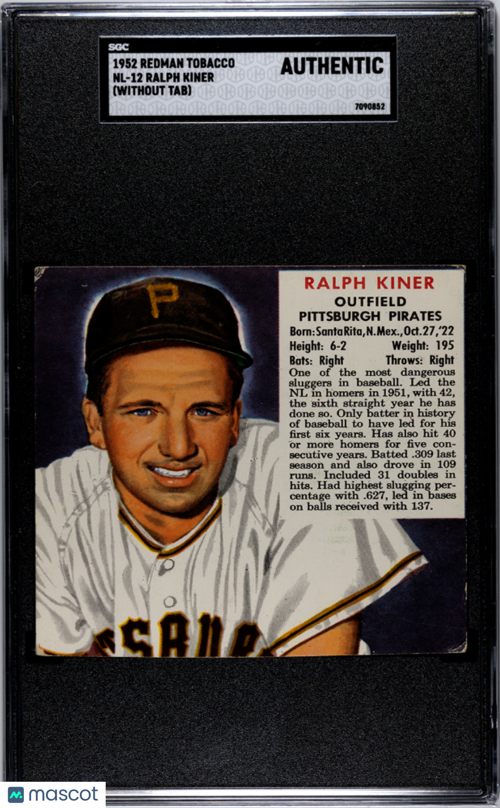 1952 Redman Tobacco Ralph Kiner #NL-12 (NO Tab) SGC A Pittsburgh Pirates HOF