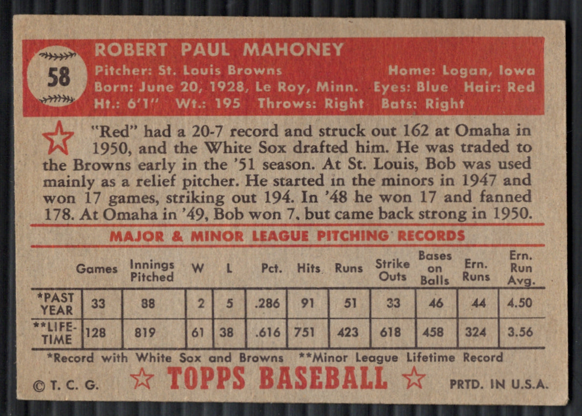 012-R68 You are purchasing a 1952 Topps Baseball Bob Mahoney #58. You will receive the exact item in the photographs. Thank you for looking. Listed With Mascot.Returns & Exchanges