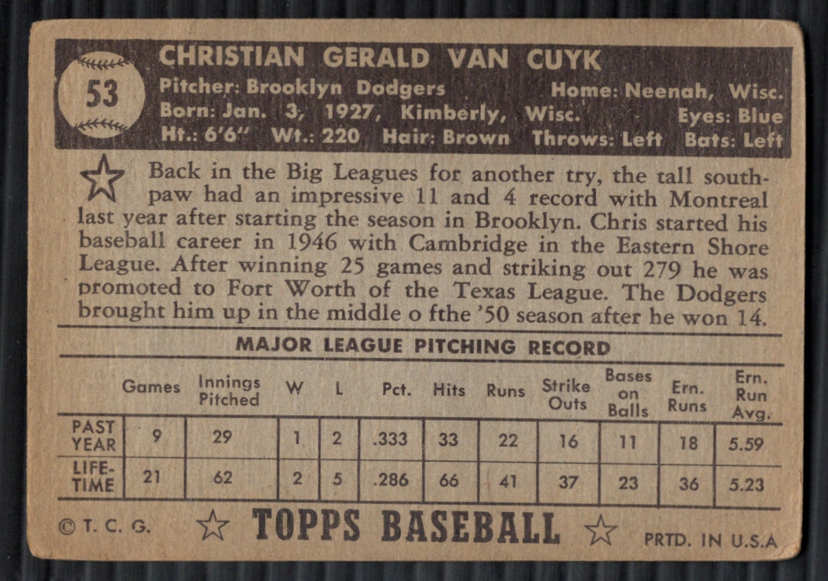 1952 Topps Baseball Chris Van Cuyk #53 Black Back VG (Crease)