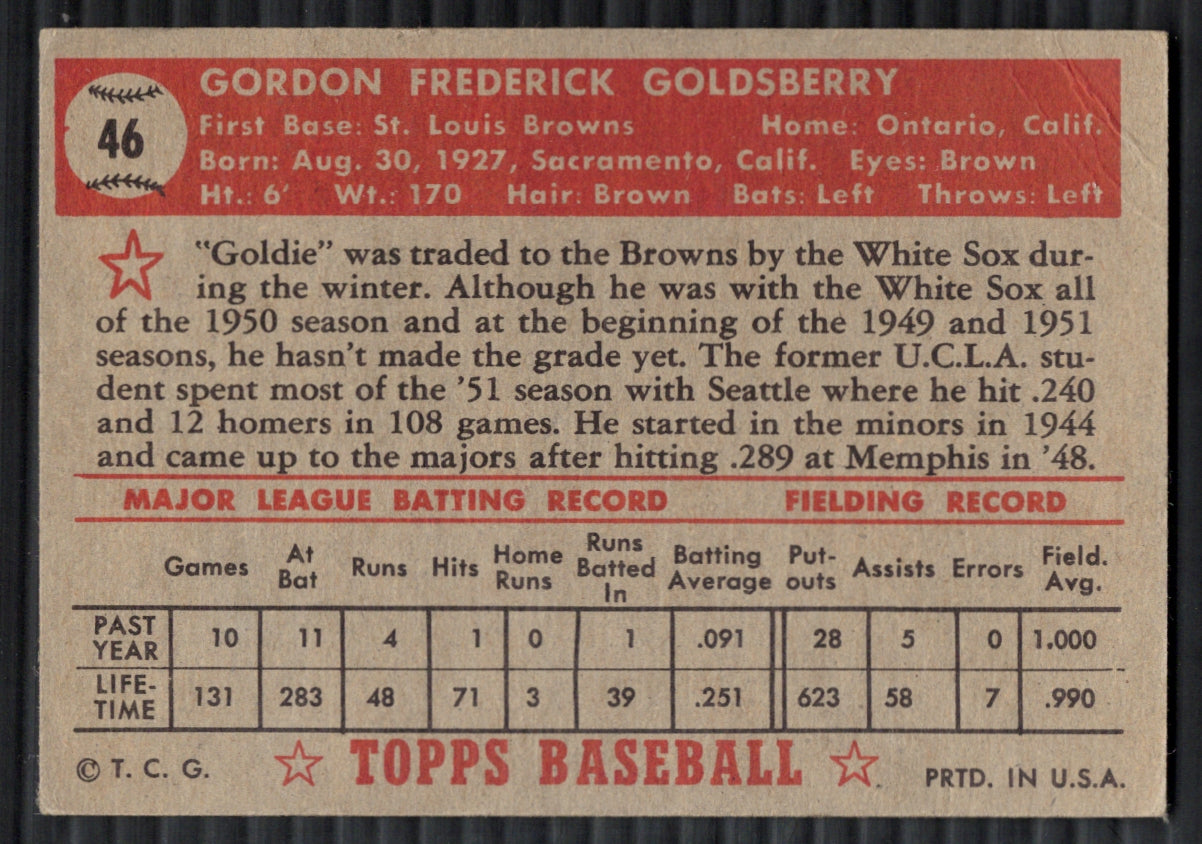 012-R72 You are purchasing a 1952 Topps Baseball Gordon Goldsberry #46. You will receive the exact item in the photographs. Thank you for looking. Listed With Mascot.Returns & Exchanges