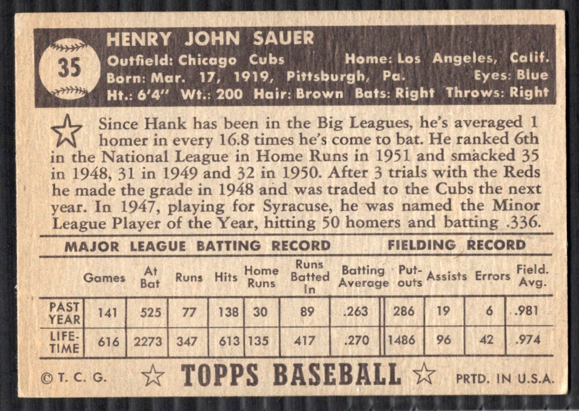 013-R17 You are purchasing a 1952 Topps Baseball Hank Sauer #35 Black Back. You will receive the exact item in the photographs. Thank you for looking. Listed With Mascot.Returns & Exchanges