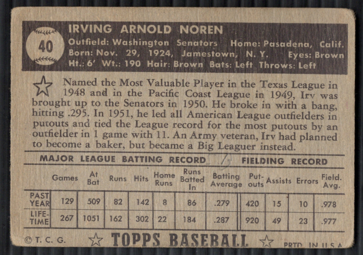 012-R77 You are purchasing a 1952 Topps Baseball Irv Noren #40. You will receive the exact item in the photographs. Thank you for looking. Card has Pencil marks Listed With Mascot.Returns & Exchanges
