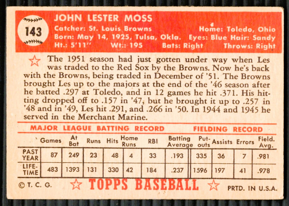 013-R75 You are purchasing a 1952 Topps Baseball Les Moss #143. You will receive the exact item in the photographs. Thank you for looking. Listed With Mascot.Returns & Exchanges