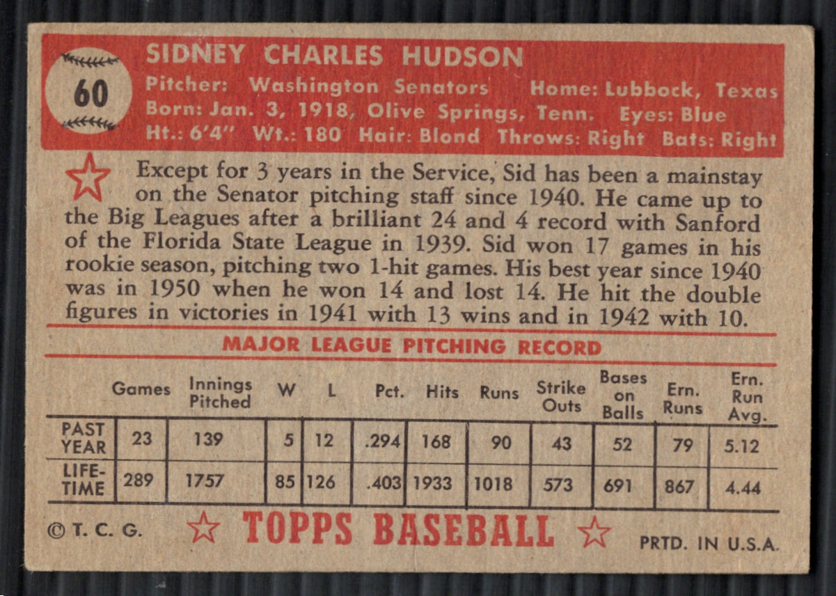 1952 Topps Baseball Sid Hudson #60 Red Back VG Light creasing