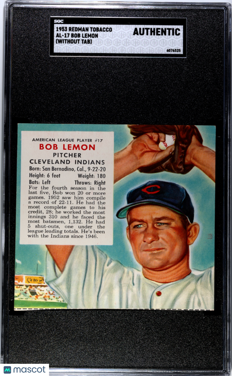 1953 Redman Tobacco Bob Lemon #AL-17 (Without Tab) SGC A Cleveland Indians HOF