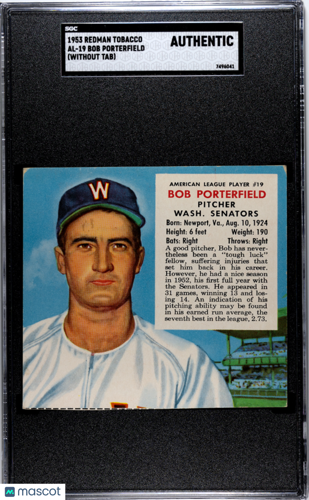 1953 Redman Tobacco Bob Porterfield #AL-19 (NO Tab) SGC A Washington Senators