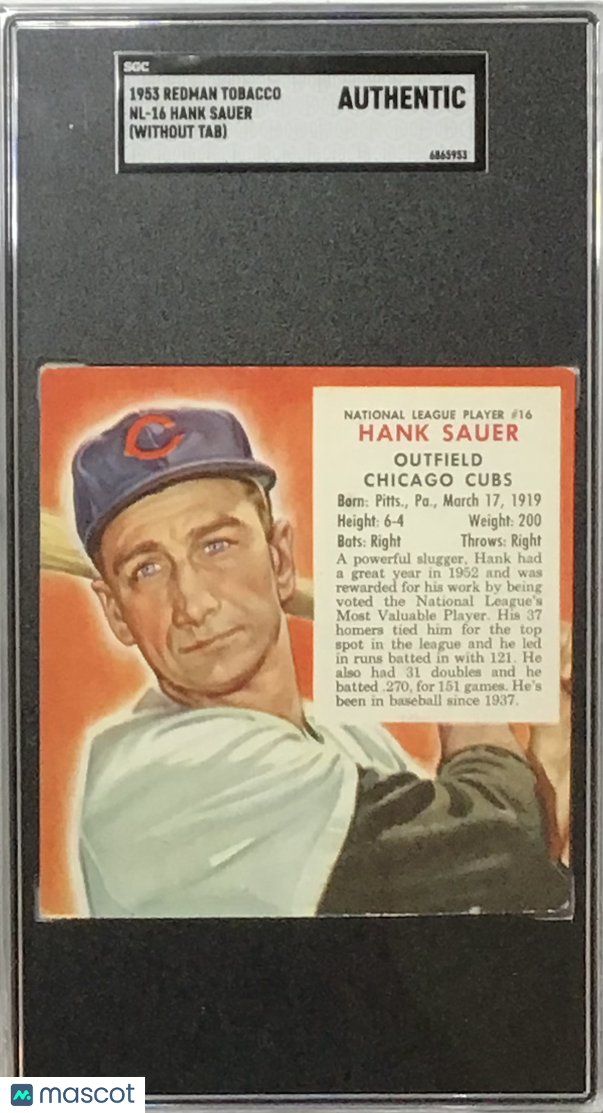 1953 Redman Tobacco Hank Sauer #NL-16 (Without Tab) SGC A Chicago Cubs