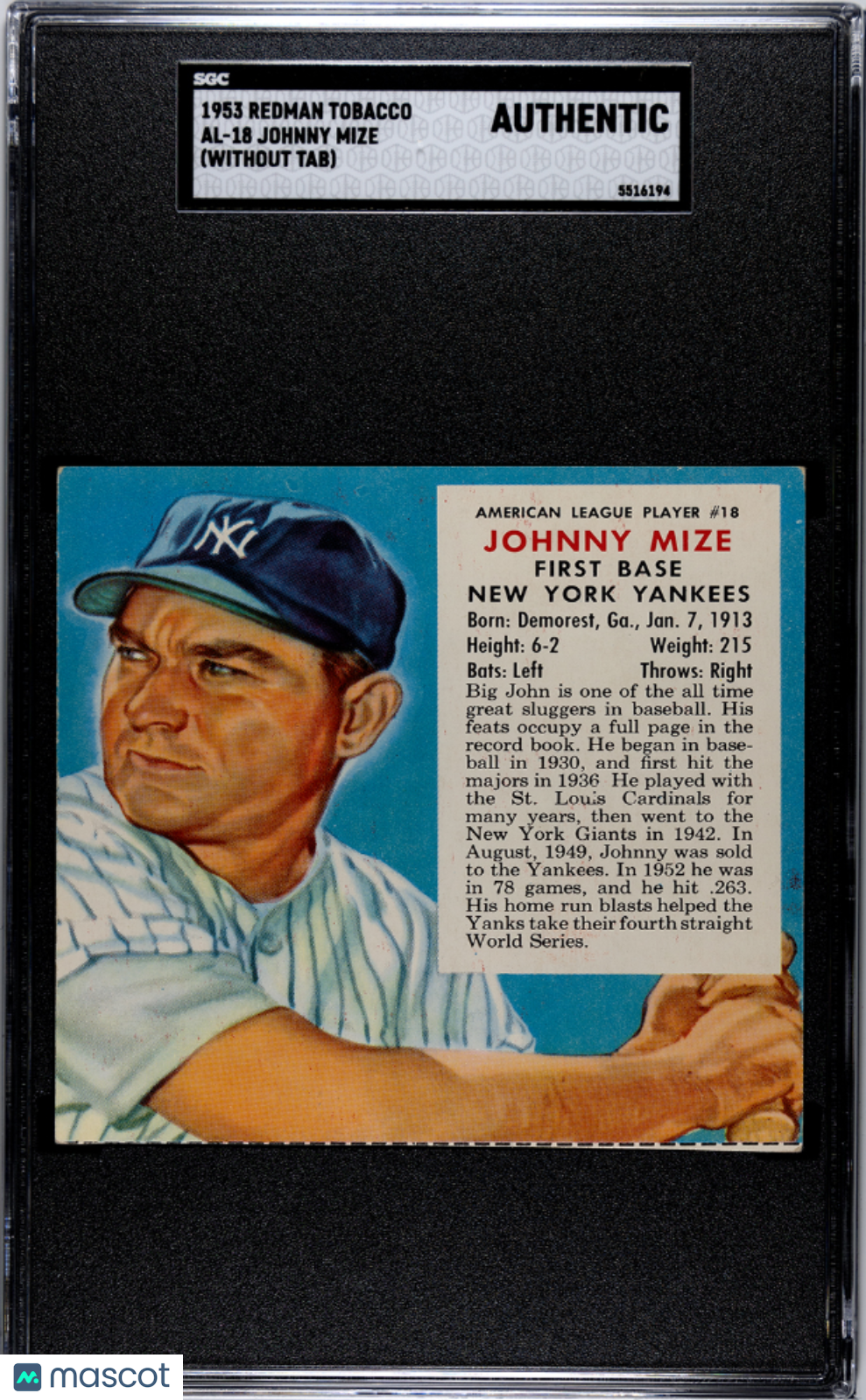 You are purchasing a 1953 Redman Tobacco Johnny Mize #AL-18 (Without Tab) SGC A. You will receive the exact item in the photographs. Thank you for looking. Listed With Mascot.Returns & Exchanges