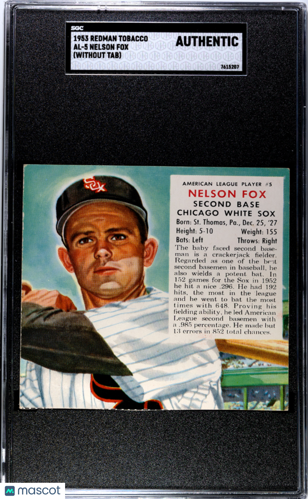 You are purchasing a 1953 Redman Tobacco Nelson Fox #AL-5 (Without Tab) SGC A. You will receive the exact item in the photographs. Thank you for looking. Listed With Mascot.Returns & Exchanges
