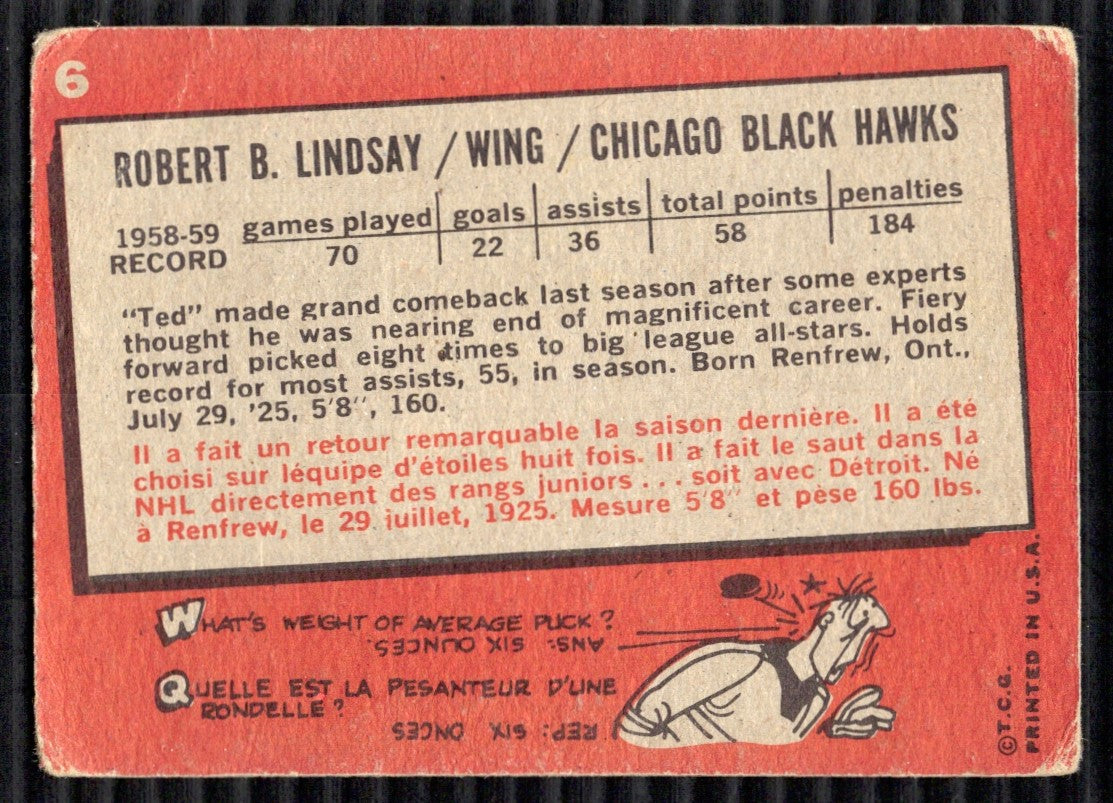 013-L46 You are purchasing a 1959 Topps Ted Lindsay #6. You will receive the exact item in the photographs. Thank you for looking. Listed With Mascot.Returns & Exchanges