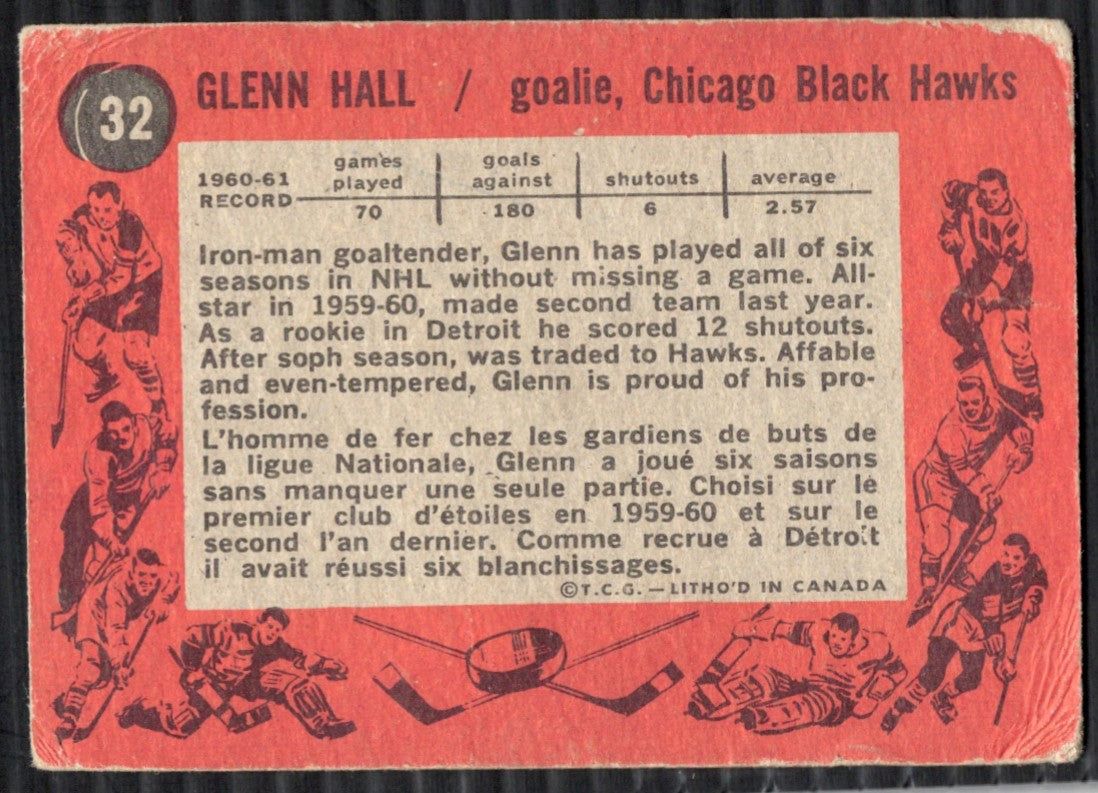 1961-62 Topps Glenn Hall #32 Chicago Blackhawks Low Grade (Creasing)