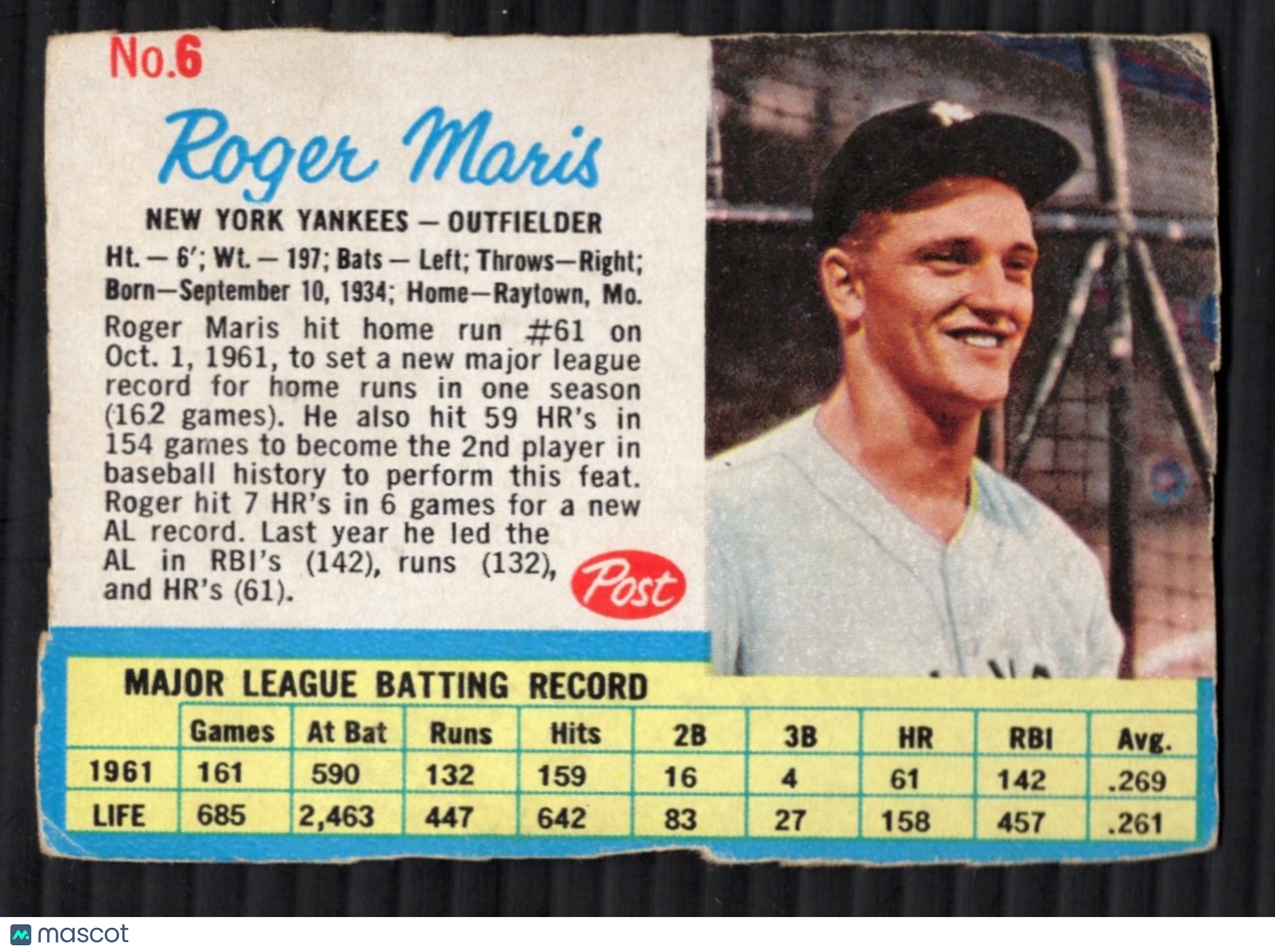 010-R28 You are purchasing a 1962 Post Roger Maris #6. You will receive the exact item in the photographs. Thank you for looking. Address Sticker on back is on the card Listed With Mascot.Returns & Exchanges