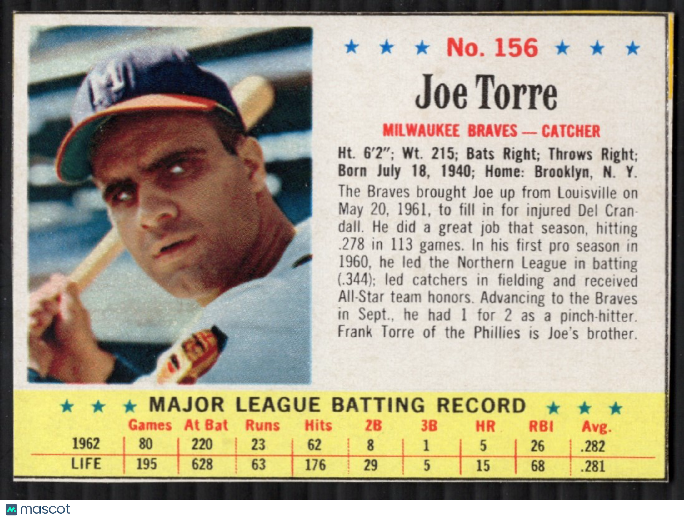 010-R34 You are purchasing a 1963 Post Cereal Joe Torre #156. You will receive the exact item in the photographs. Thank you for looking. Listed With Mascot.Returns & Exchanges