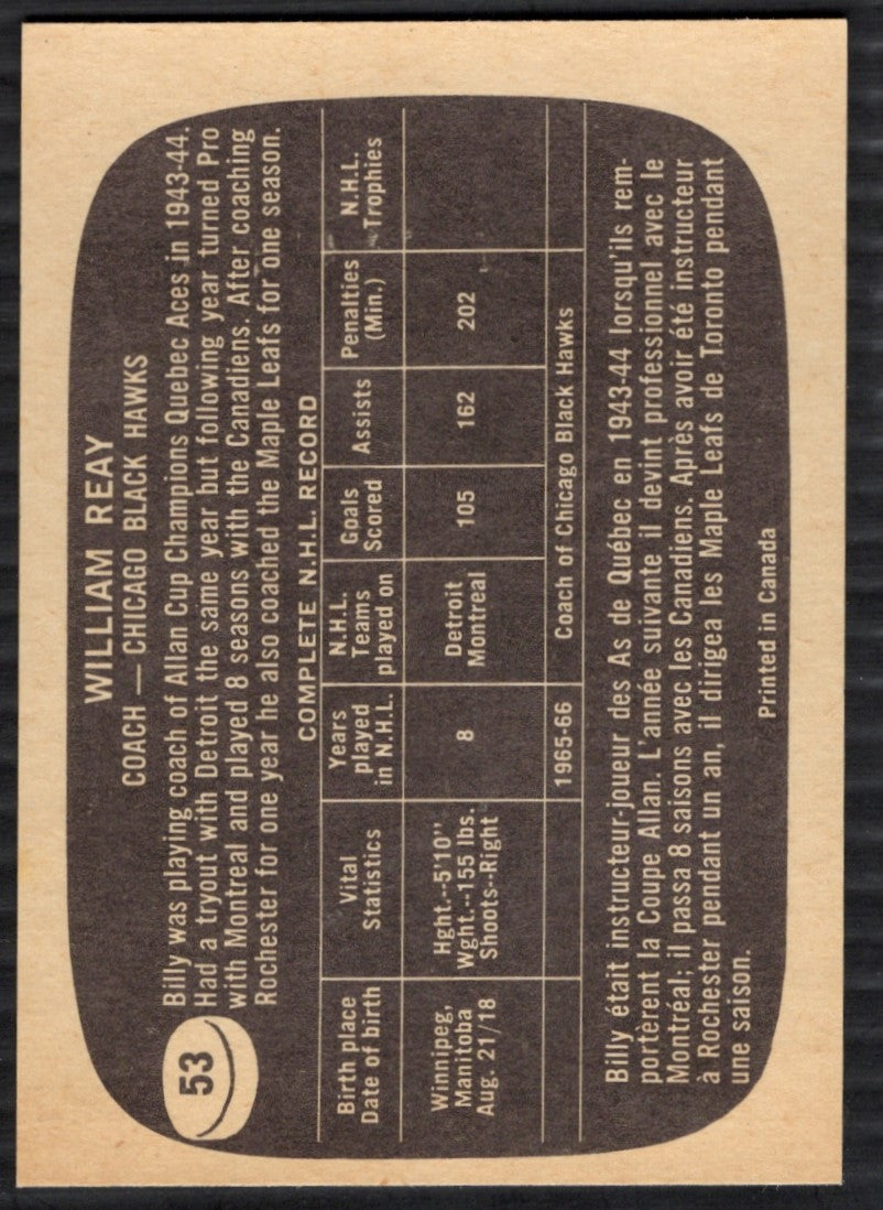 1966-67 Topps William Reay #53 Rookie RC Chicago Blackhawks EX+/NM