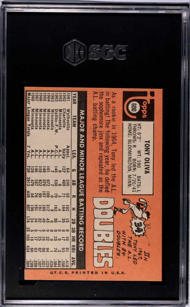 You are purchasing a 1969 Topps Tony Oliva #600 SGC 5.5. You will receive the exact item in the photographs. Thank you for looking. Listed With Mascot.Returns & Exchanges
