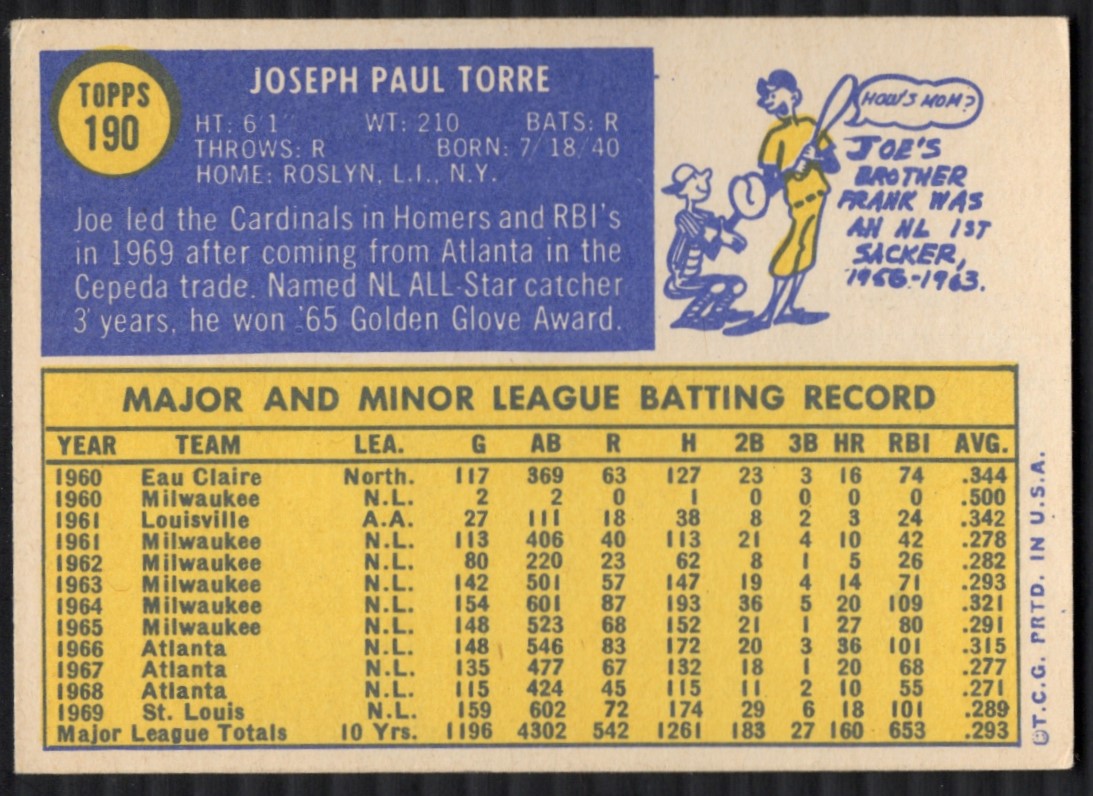 009-R16 You are purchasing a 1970 Topps Joe Torre #190. You will receive the exact item in the photographs. Thank you for looking. Listed With Mascot.Returns & Exchanges