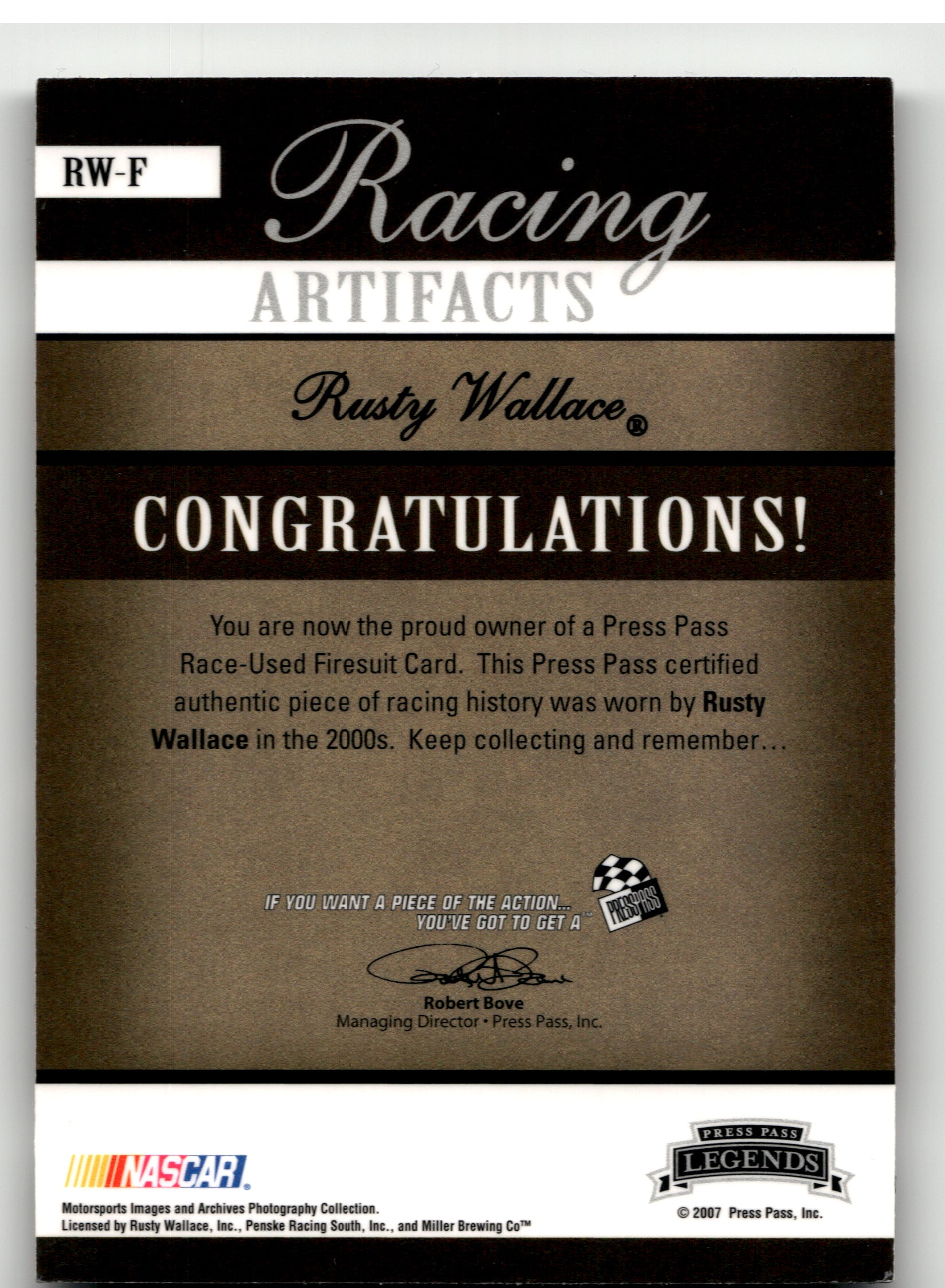 2007 Press Pass Legends Racing Artifacts Rusty Wallace #RW-F 147/199 Firesuit