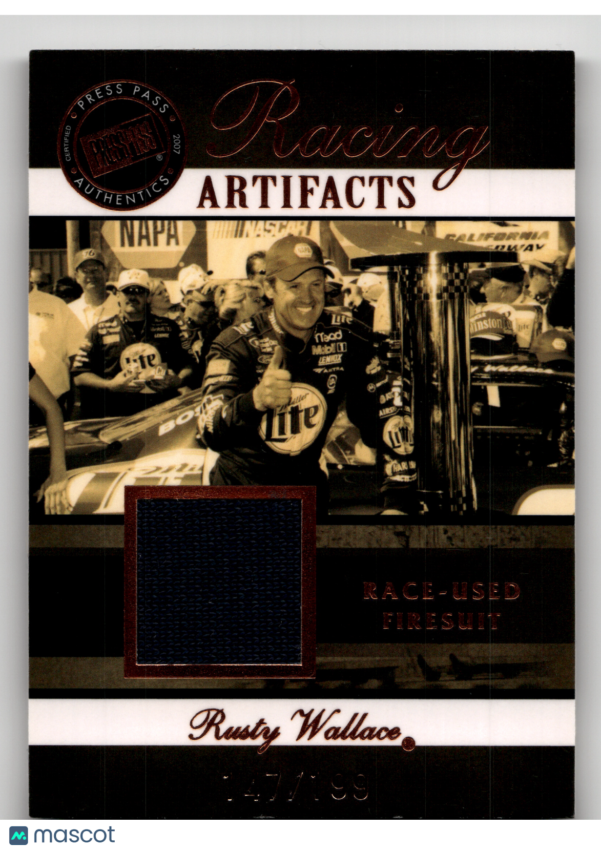 002-L30 You are purchasing a 2007 Press Pass Legends Racing Artifacts Rusty Wallace #RW-F 147/199 Race-Used Firesuit. You will receive the exact item in the photographs. Thank you for looking. Listed With Mascot.