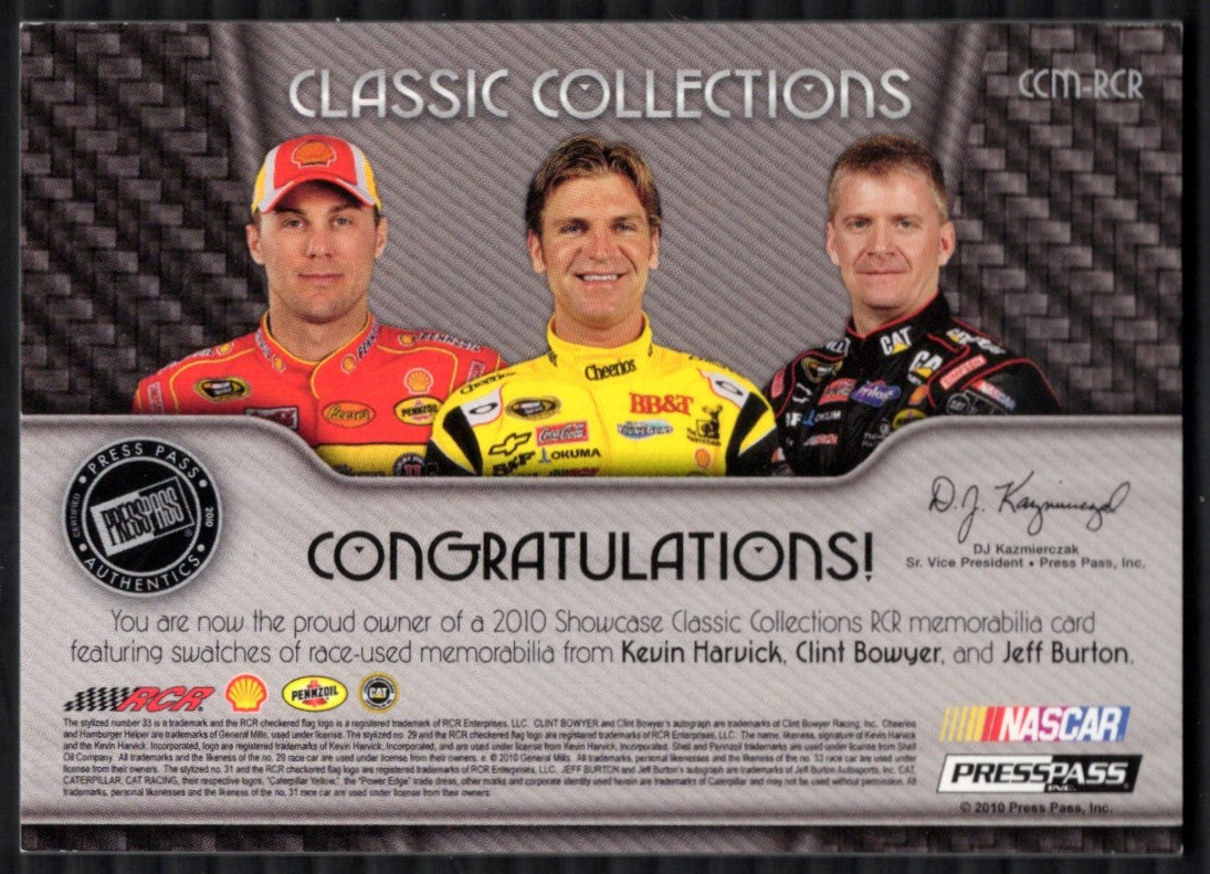 002-L55 You are purchasing a 2010 Press Pass Showcase Jeff Burton Clint Bowyer Kevin Harvick #CCM-RCR 19/25 Memorabilia Firesuit. You will receive the exact item in the photographs. Thank you for looking. Listed With Mascot.Returns & Exchanges