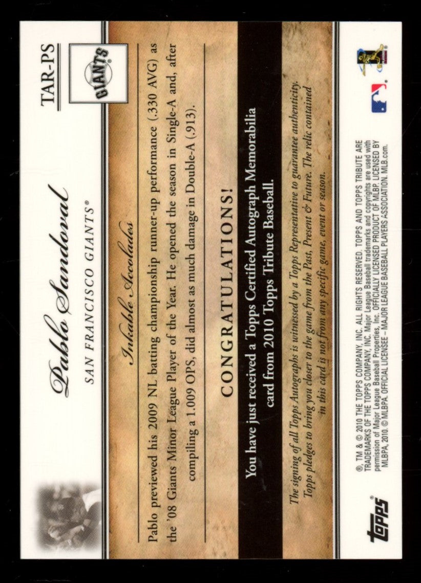 You are purchasing a 2010 Topps Tribute Pablo Sandoval #TA-PS 61/75 Autograph Memorabilia. You will receive the exact item in the photographs. Thank you for looking. Listed With Mascot.Returns & Exchanges