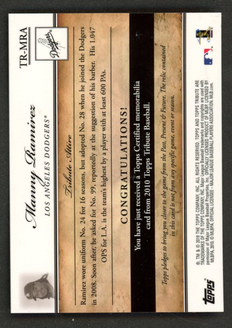 You are purchasing a 2010 Topps Tribute Manny Ramirez #TR-MRA 47/75 Game-used memorabilia. You will receive the exact item in the photographs. Thank you for looking. Listed With Mascot.