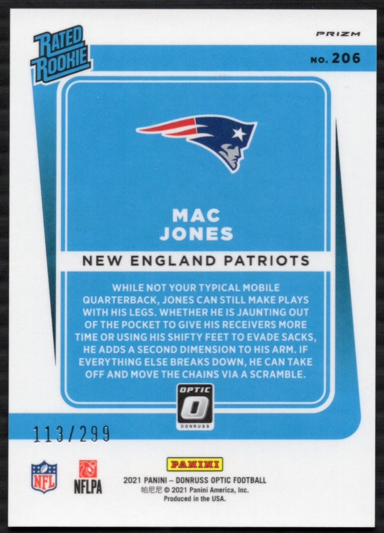 010-L54 You are purchasing a 2021 Panini Donruss Optic Prizm Mac Jones #206 113/299. You will receive the exact item in the photographs. Thank you for looking. Listed With Mascot.Returns & Exchanges