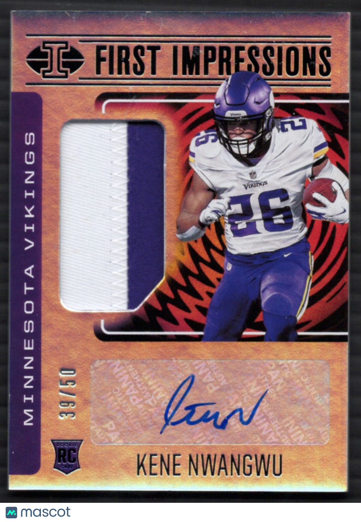 010-R7 You are purchasing a 2021 Panini Illusions First Impressions Kene Nwangwu #142 Autograph 39/50 Patch RC. You will receive the exact item in the photographs. Thank you for looking. Listed With Mascot.Returns & Exchanges