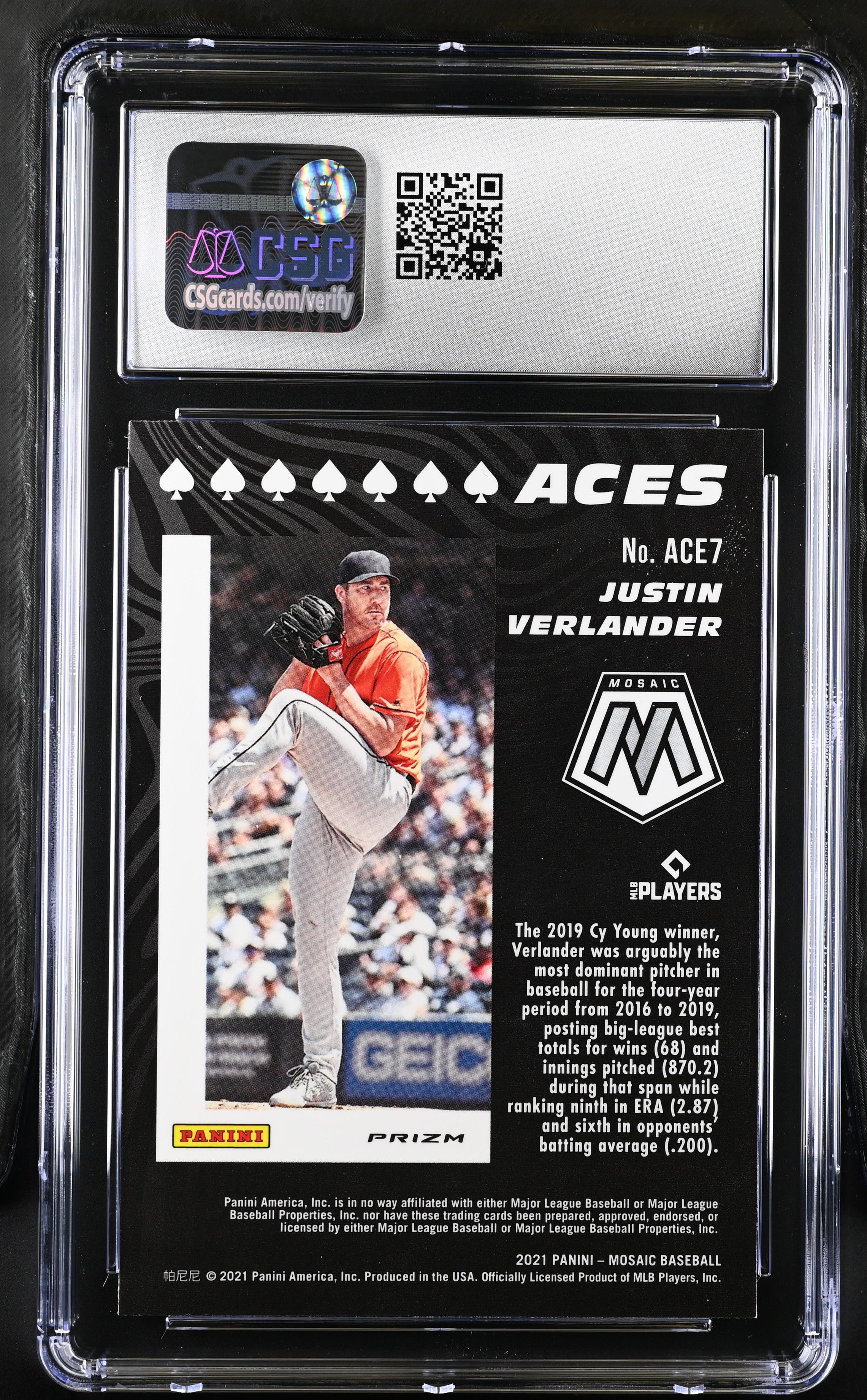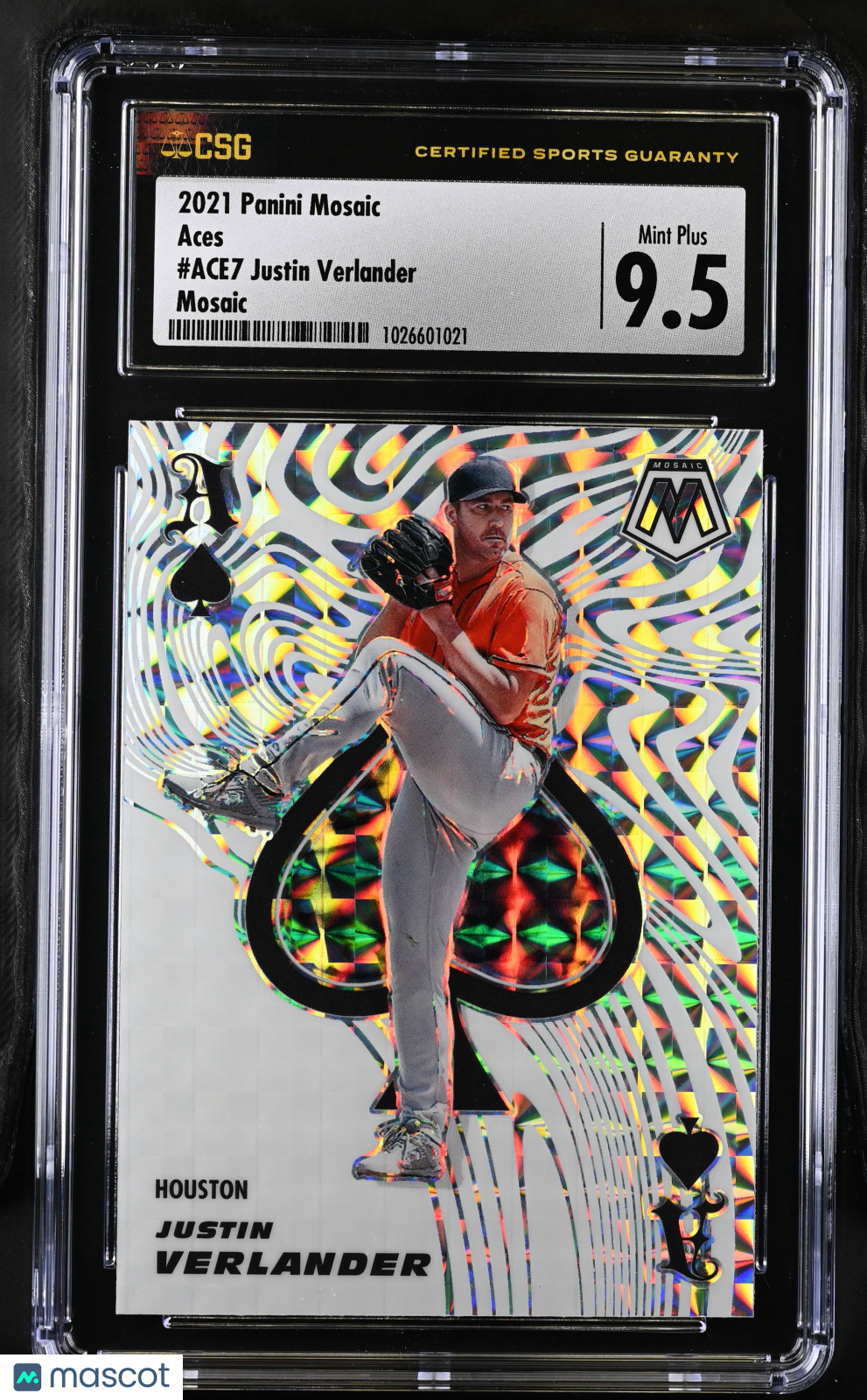 1026601021-C5-1 You are purchasing a 2021 Panini Mosaic Justin Verlander #ACE7 Mosaic Aces CSG 9.5. You will receive the exact item in the photographs. Thank you for looking. Listed With Mascot.Returns & Exchanges