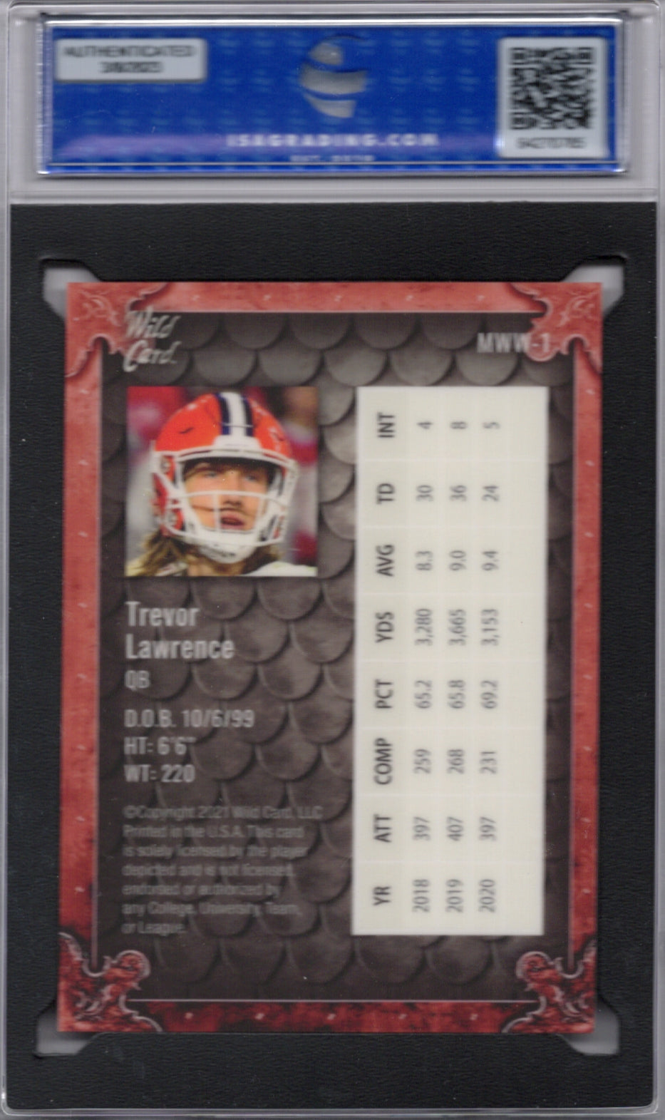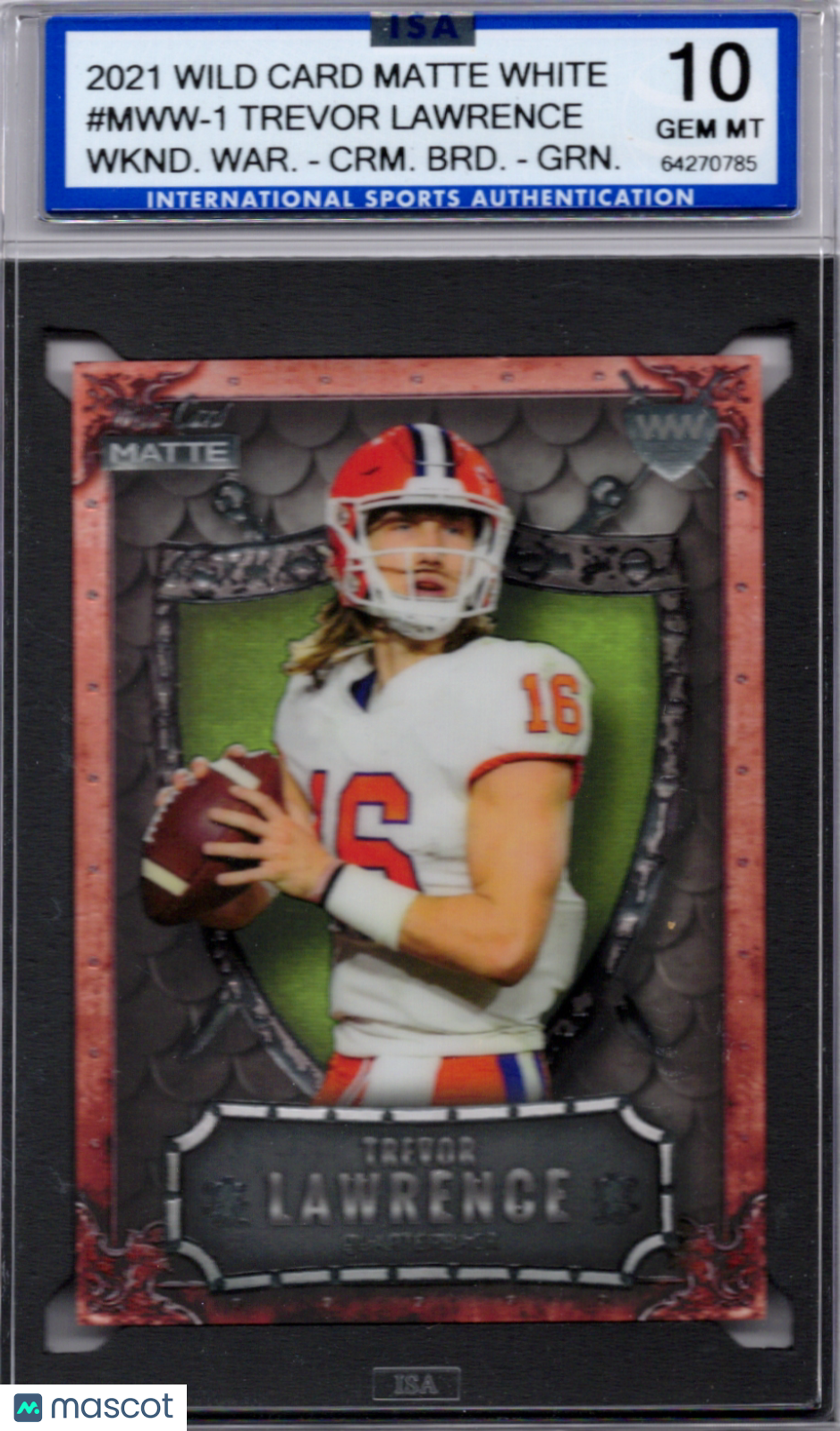 64270785-G1-1 You are purchasing a 2021 Wild Card Matte White Trevor Lawrence #MWW-1 Weekend Warrior - Crimson Border - Green ISA 10. You will receive the exact item in the photographs. Thank you for looking. Listed With Mascot.Returns & Exchanges
