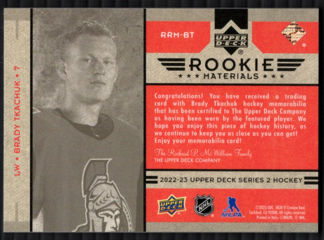 2022-23 Upper Deck Rookie Materials Brady Tkachuk #RRM-BT Rookie Materials