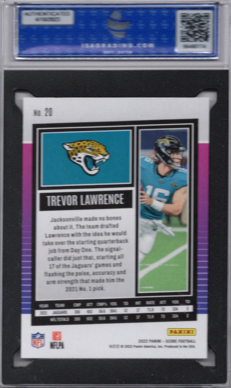 66480774-G1-1 You are purchasing a 2022 Panini Score Trevor Lawrence #20 ISA 10. You will receive the exact item in the photographs. Thank you for looking. Listed With Mascot.Returns & Exchanges