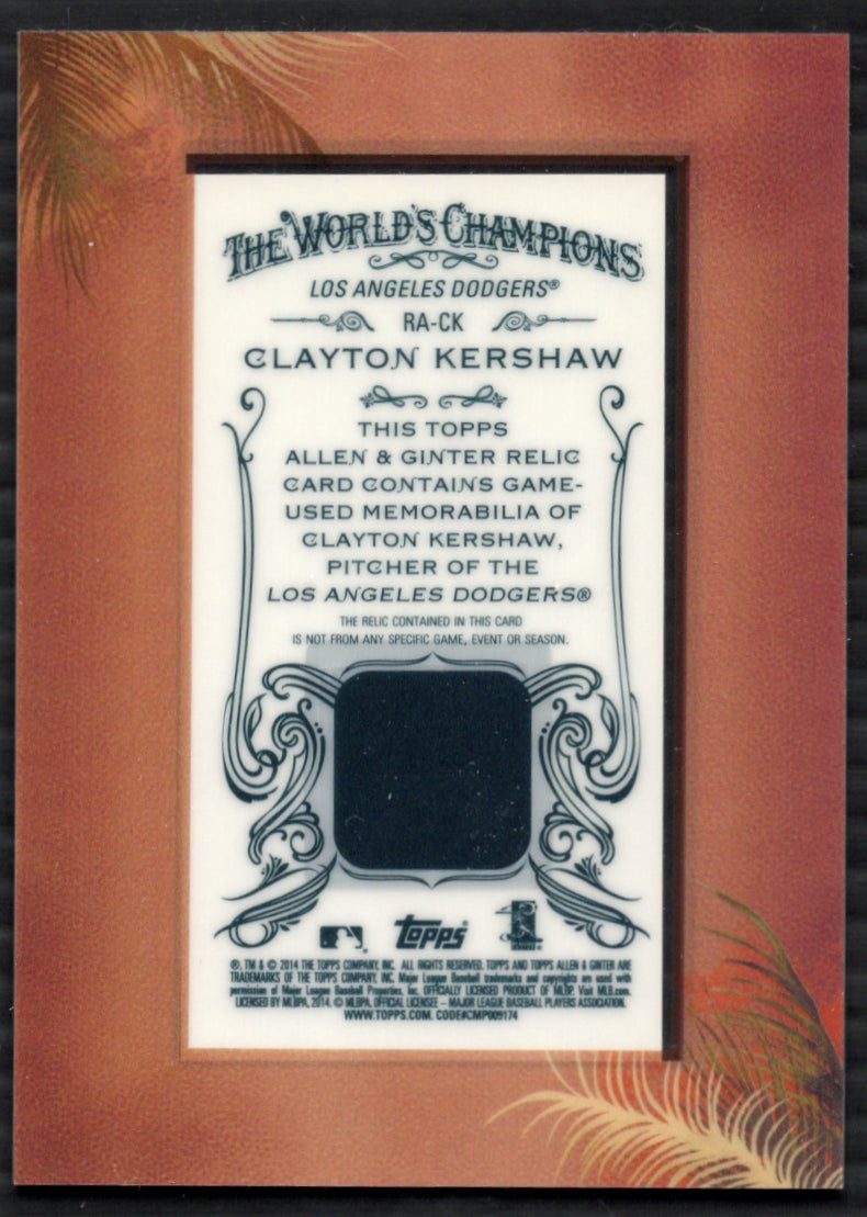 002-R79 You are purchasing a 2014 Topps Allen & Ginter's Clayton Kershaw #RA-CK Game-Used Memorabilia. You will receive the exact item in the photographs. Thank you for looking. Listed With Mascot.Returns & Exchanges