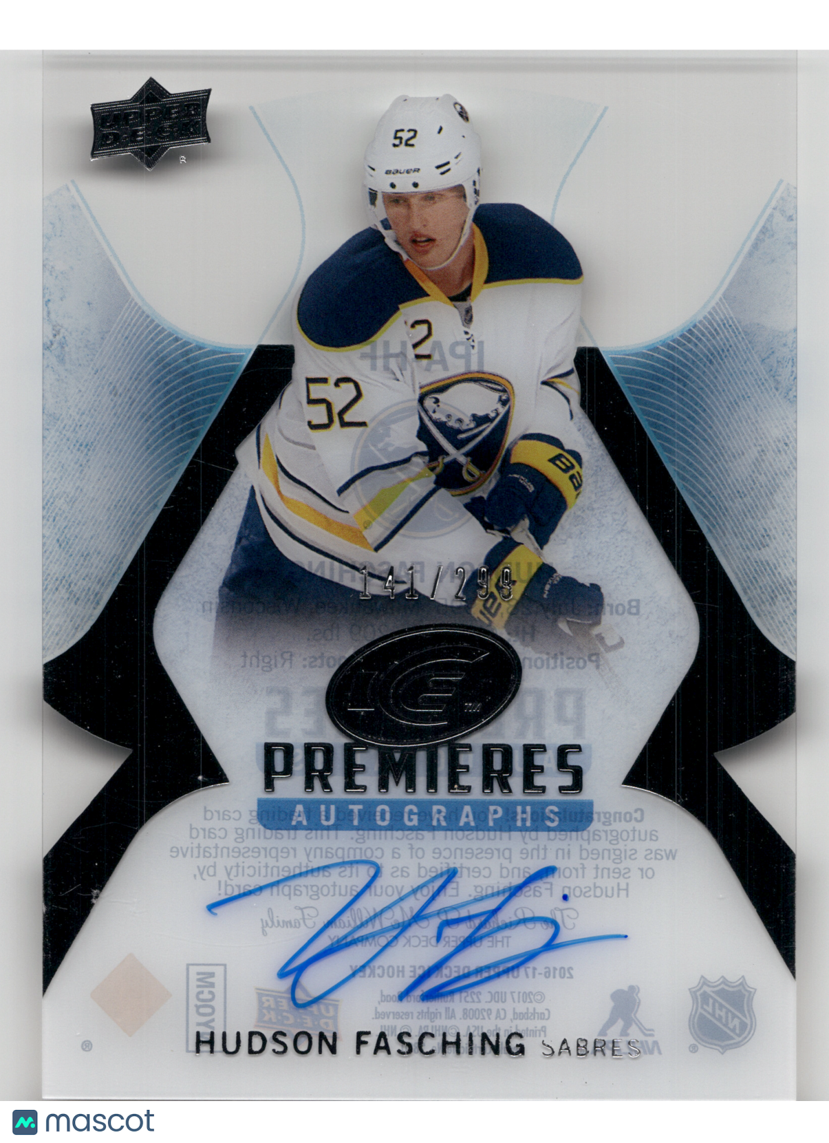 You are purchasing a 2016-17 Upper Deck Ice Premieres Autographs Hudson Fasching #IPA-HF Autograph 141/299. You will receive the exact item in the photographs. Thank you for looking. Listed With Mascot.Returns & Exchanges