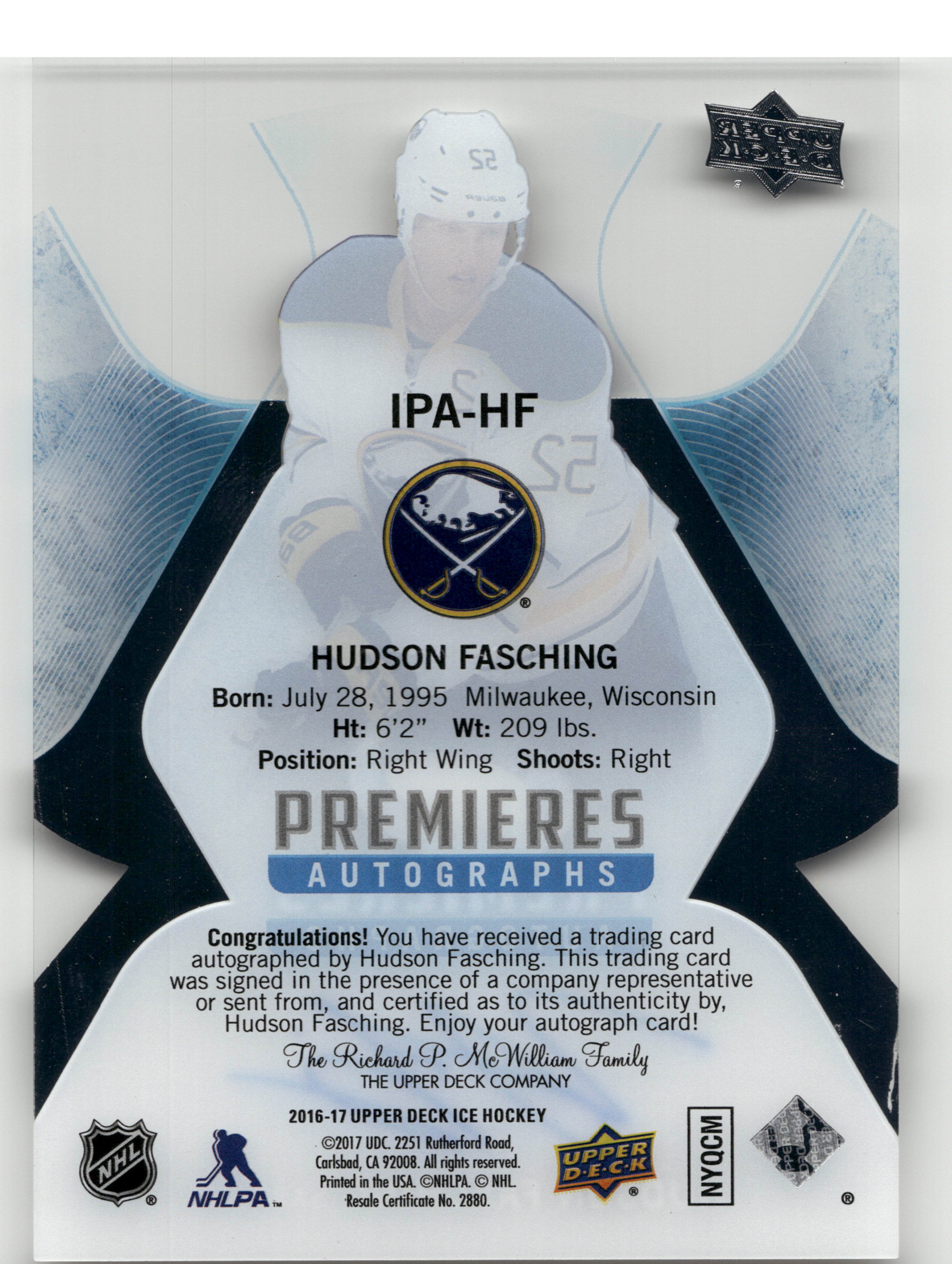 Hudson Fasching 2016-17 Upper Deck Ice Ice Premieres Auto Card #IPA-HF 141/299